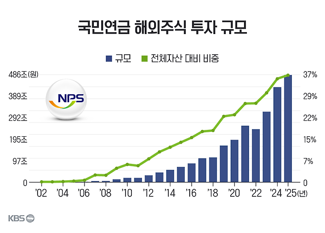 이를 위해 국민연금은 해외투자를 꾸준히 늘리고 있습니다. 이미 투자한 해외 주식·채권·부동산 등이 700조 원이 넘습니다. 해외 주식만 쳐도 486조 원, 전체 적립금의 37% 수준입니다.