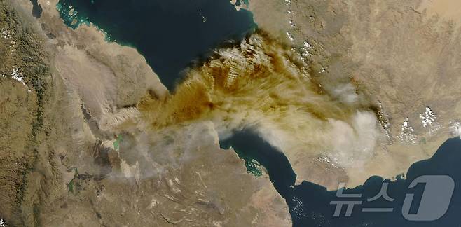 (로이터=뉴스1) 김지완 기자 = 23일(현지시간) 에티오피아 동북부 아파르 지역에 위치한 하일리구비 화산이 폭발해 생긴 화산재 구름이 홍해를 건너 이동하고 있는 모습을 담은 위성사진. 사진은 미 항공우주국(NASA·나사) 제공. 2025.11.23