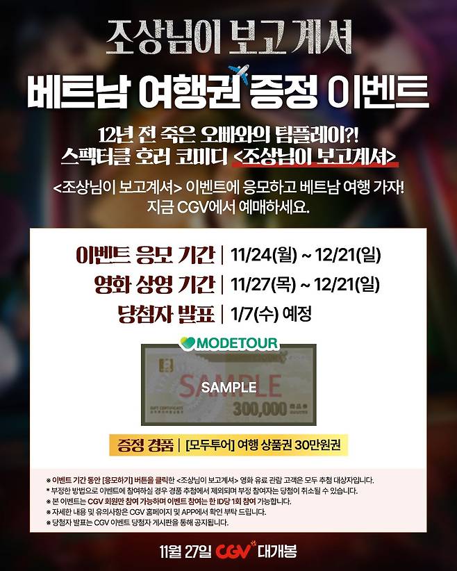 호러 코미디 영화 '조상님이 보고계셔'가 영화 관람객을 대상으로 베트남 여행권 증정 이벤트를 개최한다.