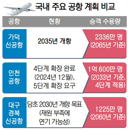 정부가 가덕신공항 개항 일정을 2035년으로 크게 늦추면서 그 사이 인천공항 5단계 확장 사업이 새로 진행되고, 대구경북신공항 개항이 이뤄질 가능성이 높아졌다.
