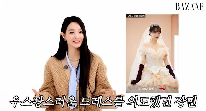 지난해 드라마 '손해 보기 싫어서'에서 과한 프릴과 팔꿈치까지 올라오는 긴 장갑이 돋보이는 웨딩드레스로 화제의 중심에 섰던 신민아는 "일단 의도는 우스꽝스러운 드레스를 입는 거였는데 약간 세일러 문 같기도 하고 재밌었다"라고 말했다.