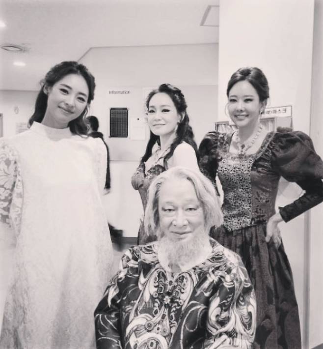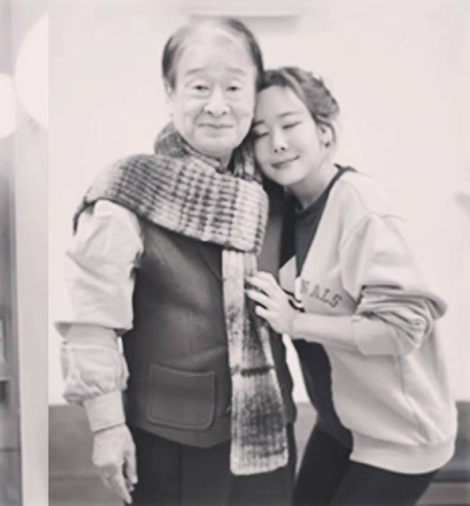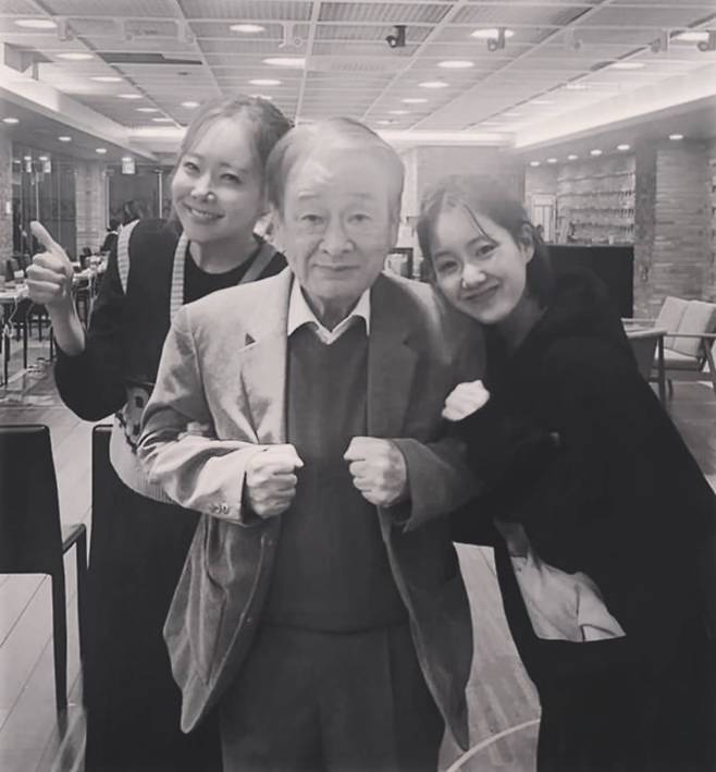 소유진이 이순재의 어깨에 기대 다정하게 미소 짓는 모습부터, 두 사람이 연극 분장을 한 채 다른 배우들과 함께 서 있는 모습까지, 사진 한 장 한 장에 스승과 제자의 깊은 정이 느껴진다.