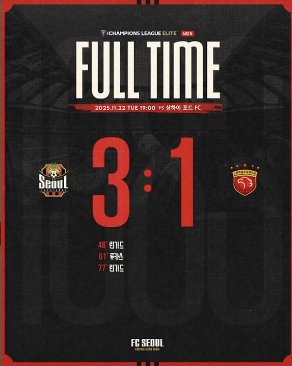 서울은 25일 오후 7시 중국 상하이의 푸동국제경기장에서 열린 '중국슈퍼리그 챔피언' 상하이 하이강와의 2025~2026시즌 아시아챔피언스리그 엘리트(ACLE) 리그 스테이지 5차전 원정경기에서 린가드의 2골 1도움에 힘입어 3대1 승리했다.