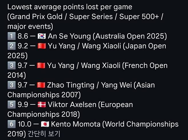 매체는 2017년까지 유지됐던 BWF 슈퍼시리즈 프리미어(지금의 슈퍼 1000급), 슈퍼시리즈(지금의 슈퍼 750급), 그랑프리 골드(지금의 슈퍼 500급), 그리고 2018년부터 진행되고 있는 BWF 슈퍼 1000·750·500, 그리고 올림픽, 세계선수권 등 메이저 이벤트를 모두 합쳐 안세영의 이번 호주 오픈 게임당 8.6실점은 역대 1위라고 소개했다.