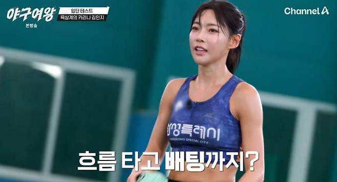 이날 '야구여왕' 입단 테스트가 펼쳐진 가운데 육상계 카리나로 불리는 김민지가 도전장을 냈다. 근육질 몸매의 김민지는 육상선수다운 경쾌한 스텝과 기대 이상의 투구로 코치 윤석민을 놀라게 했다.