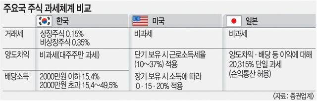 배당소득세도 일본과 미국의 사례를 참고할 만하다. 주요국은 경쟁국의 과세제도를 고려해 배당과 양도소득 과세체계를 간소하게 일치시키는 기조다. 불리한 과세체계가 자본유출 등 국내 자본시장 경쟁력 저하로 이어질 우려가 있어서다. 일본은 배당소득에도 양도세와 같은 20.315%를 적용한다. 미국도 주식을 61일 이상 가지고 있다면 양도세와 마찬가지로 소득에 따라 0·15·20% 세율로 과세한다.
