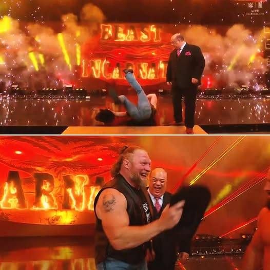 매체에 따르면 이날 레스너는 'Mondaynight RAW'이벤트에서 오랜 파트너 폴 헤이먼과 함께 등장했고, 로건 폴·브론 브레이커·브론슨 리드·드류 맥킨타이어로 구성된 서바이버 시리즈 팀도 뒤를 이었다. 하지만 팀이 무대 중앙으로 향하던 순간, 레스너는 자신의 시그니처인 '파이로 존' 연출을 밟기 위해 방향을 틀다 폭죽이 터지자마자 중심을 잃고 그대로 뒤로 넘어졌다.
