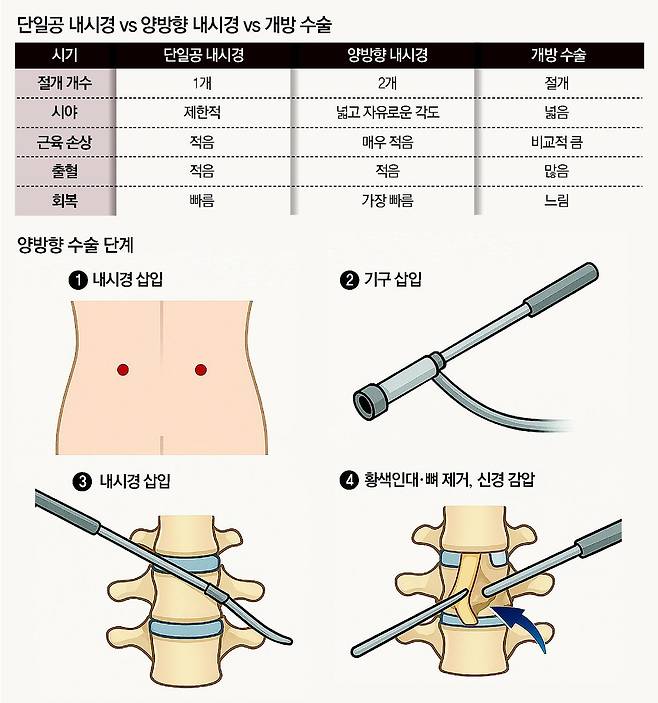 “개방 수술은 근육을 크게 벌리기 때문에 출혈, 통증이 심하고 회복 기간이 길 수밖에 없다. 양방향 내시경은 상처가 작고 근육 손상을 최소화해 2∼3일 입원으로 충분한 경우가 많다. 기존 절개 수술 수준으로 충분한 감압을 하면서도 조직 손상은 훨씬 적다는 점이 장점이다.”