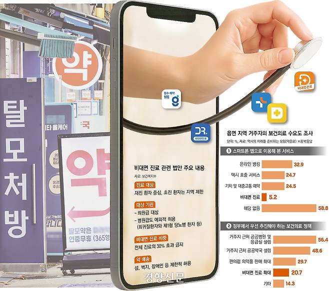 비대면 진료 플랫폼의 이용 양태가 ‘의료 취약계층의 접근성 강화’와는 거리가 있다는 뜻으로 풀이된다. 약사의 미래를 준비하는 모임이 여론조사기관 (주)리서치앤리서치에 의뢰해 지난 7월 24일부터 8월 4일까지 읍·면지역에 거주하는 502명을 조사한 결과, 스마트폰으로 비대면 진료를 이용해봤다는 응답은 5.2%에 그쳤다. 60대 이상에선 2.5%에 불과했다. 읍·면 지역 주민들이 가장 시급한 보건의료 정책으로 꼽은 것은 ‘공공병원 및 응급실 설립(56.4%)’과 ‘공공약국 설립(48.6%)’이었다. 복수 선택이 가능함에도 ‘비대면 진료 확대’를 원한다는 응답은 20.7%에 그쳤다.