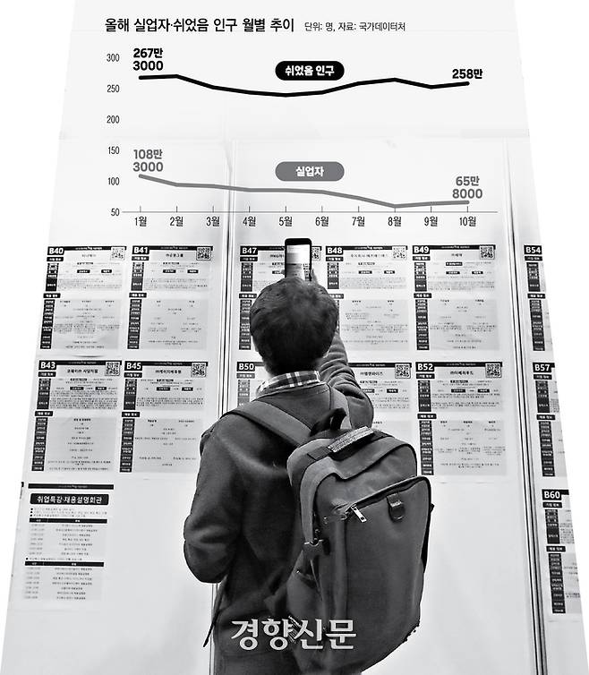 ‘쉬었음’ 인구는 일할 능력이 있지만 가사·육아·질병·학업 등 특별한 사유 없이 최근 4주간 구직활동을 하지 않은 경우 분류된다. 올해 10월까지 ‘쉬었음 인구’는 월평균 254만7000명으로, 지난해 같은 기간(246만7000명)보다 3.2% 늘었다. 같은 기간 실업자가 월평균 81만1000명에서 80만8000명으로 0.4% 감소한 것과 대비된다.