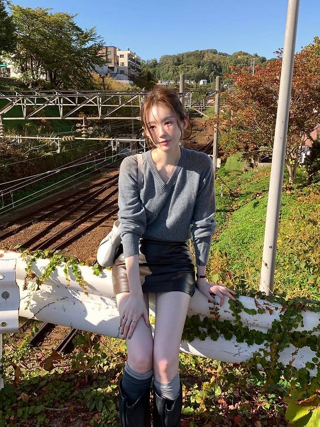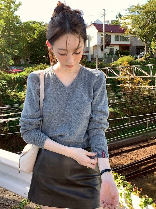 공개된 사진 속 강민경은 회색 브이넥 니트와 블랙 레더 미니 스커트를 매치해 담백하면서도 시크한 가을 룩을 선보였다.