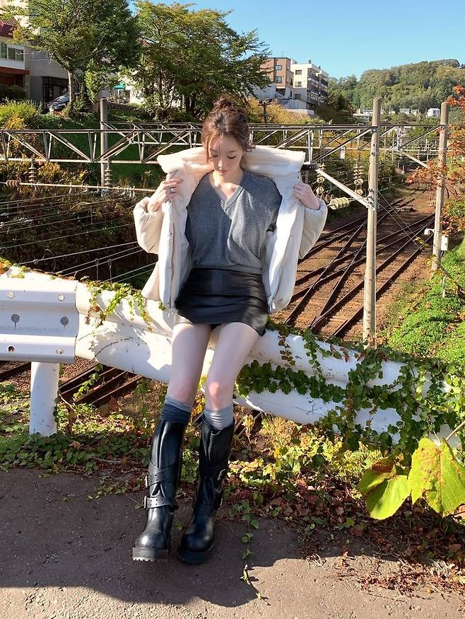 지난 25일 강민경은 자신의 SNS에 별다른 멘트 없이 여러 장의 사진을 게재했다. 공개된 사진 속 강민경은 회색 브이넥 니트와 블랙 레더 미니 스커트를 매치해 담백하면서도 시크한 가을 룩을 선보였다.