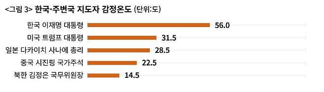 주변국 ‘지도자’에 대한 감정온도 측정 결과도 흥미롭다. 이재명 대통령이 56도로 가장 높았고, 트럼프 미국 대통령은 31.5도였다(〈그림 3〉). 2021년 조사 때는 문재인 대통령이 44.7도, 바이든 미국 대통령이 46.6도였다. 취임 1년 차라는 특성이 있지만 한국 대통령에 대한 호감도가 10도 이상 올라갔다. 반면 미국 대통령에 대한 호감도는 15도 이상 내려갔다. 시진핑 주석에 대한 호감도는 4년 전에 비해 3.5도 올랐다. 이번 조사는 APEC 정상회의 직후인 11월4~5일 이루어졌다. 한국리서치 이동한 여론본부 차장은 “APEC 회담의 ‘컨벤션 효과’가 이번 조사에 반영됐을 것으로 보인다”라고 분석했다.