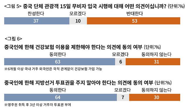 지방선거 투표권도 마찬가지였다. 외국인 가운데 중국인에 한해서만 투표권을 주지 말자는 의견에 대해 64%가 동의했다. 이것은 분명히 차별을 전제로 한 질문이었다. 중국인 대상 건강보험 적자가 감소해 지난해 흑자로 돌아섰다는 보건 당국의 설명이 있었고, 영주권 취득 후 3년 이상 지난 거주자에 한해 투표권이 주어진다는 제약이 있음에도 조사 결과는 이랬다. 중국인의 3대 쇼핑(의료·부동산·선거)을 막겠다는 국민의힘의 구호가 먹힌 결과일까?