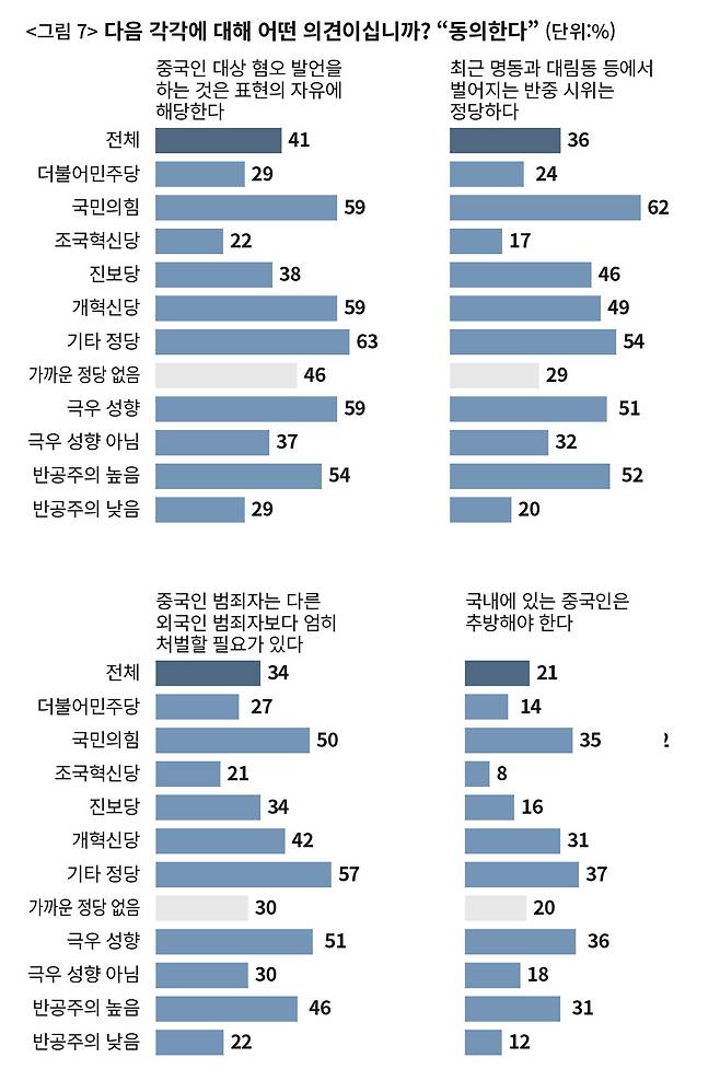 중국에 대한 감정온도의 경우 민주당 호감층에서 34.8도인 반면, 국민의힘 호감층에서는 22.4도였다. ‘중국인 무비자 입국에 찬성’하는 응답이 민주당 호감층에서는 50%였으나 국민의힘 호감층에서는 27%에 불과했다. ‘반중·혐중 시위의 주장이나 취지에 공감한다’라는 진술에 대해서도 민주당 호감층의 63%가 동의하지 않았는데(동의는 29%), 국민의힘 호감층에서는 거꾸로 63%가 동의했다(비동의는 31%).