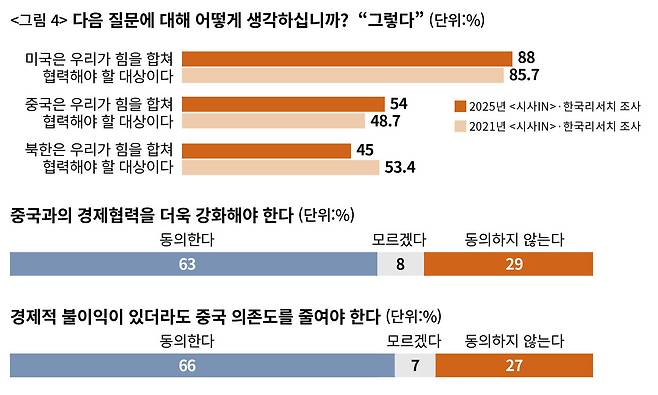 미국, 중국, 북한을 각각 놓고 ‘협력해야 할 대상’이라고 생각하는지 물었다(〈그림 4〉). 미국에 대해서는 88%, 중국에 대해서는 54%, 북한에 대해서는 45%가 “그렇다”라고 답했다. 2021년 조사와 비교하면 미국은 2.3%포인트, 중국은 5.3%포인트 올랐다. 북한은 8.4%포인트 떨어졌다.