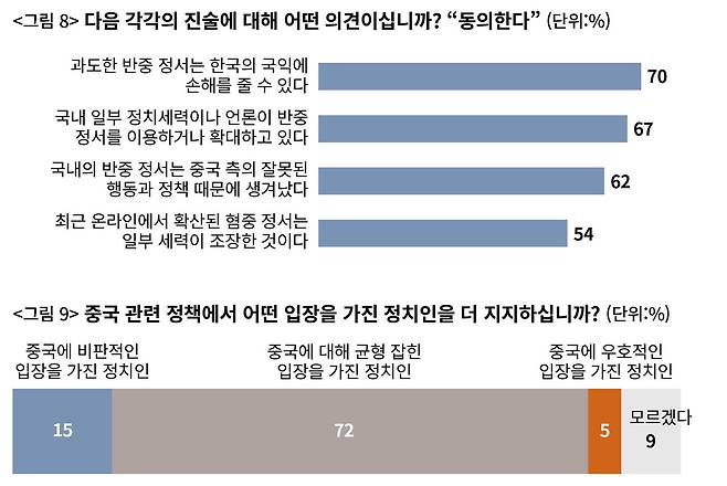 국내에 만연한 ‘반중 정서 자체’에 대한 인식은 어떨까. 〈그림 8〉은 이와 관련된 문항들이다. ‘과도한 반중 정서는 한국의 국익에 손해를 줄 수 있다’라는 데 70%가 동의했다. 다음 질문이 중요하다. ‘국내 일부 정치세력이나 언론이 반중 정서를 이용하거나 확대하고 있다’라는 문항이다. 여기에도 67%가 동의했다. ‘최근 온라인에서 확산된 혐중 정서는 일부 세력이 조장한 것이다’라는 질문에도 54%가 동의했다. 일부 정치세력과 언론이 반중 정서를 악용하고 있다고 생각하는 응답자가 전체의 3분의 2를 넘었다.