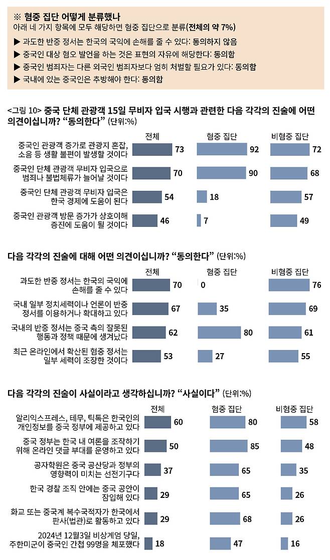이번 조사 결과를 살펴보면서 궁금증이 생겼다. ‘중국인 추방’ ‘중국인 범죄자 더 엄히 처벌’ 등에 모두 동의하는 이들을 묶어 ‘혐중 집단’으로 분류한 뒤 이들과 나머지 여론의 차이를 살펴보면 어떤 지형이 발견될까?
