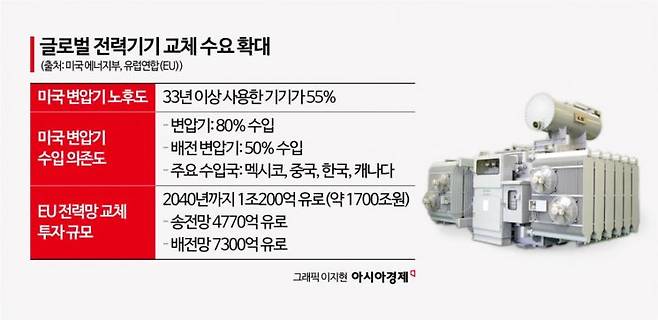 노후 망 교체 수요는 유럽에서도 본격화하고 있다. 유럽연합(EU)은 최근 발표한 에너지망(網) 전망에서 2040년까지 송전망 4770억유로(약 820조원), 배전망 7300억유로 등 총 1조2000억유로 규모의 투자가 필요하다고 제시했다. 유럽 주요국 송전망의 평균 사용 연한이 40~50년에 달하는 점을 고려하면 변압기·케이블 교체 수요가 장기간 이어질 가능성이 높다.