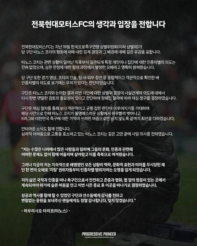 전북은 구단 SNS를 통해 '전북 현대 모터스FC의 생각과 입장을 전합니다'라는 글을 게시하면서 타노스 코치가 심리적 부담을 이유로 고심 끝에 사임 의사를 전했다고 25일 공식 발표했다.