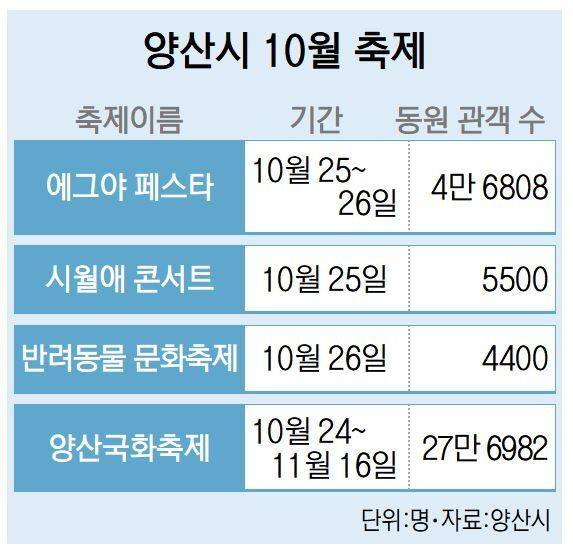 에그야 페스타의 흥행과 함께 열린 두 행사의 부대효과로 같은 달 24일 개막한 ‘양산국화축제’ 첫 주말 방문객도 지난해보다 무려 63% 늘어났다.