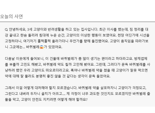 A. 안녕하세요. '24시 센트럴 동물메디컬센터' 원장이자 '24시간 고양이 육아대백과'의 저자 김효진 수의사입니다. 오늘은 바퀴벌레 잡는 약이 과연 고양이에게 안전할까 걱정이 든 집사님의 사연이네요. 예전에도 진료실에서 같은 질문을 받아보기도 했고, 저도 집에 방역 제품을 설치할 때 어떤 제품이 더 안전할까 고민한 적이 있는데요. 제 경험과 알아본 정보를 종합해서 바퀴벌레를 포함한 해충을 구제할 때 어떤 제품을 선택해야 고양이에게 좀 더 안전한지, 또 고양이가 살충제에 노출됐을 때 어떻게 하면 좋을지 알아보겠습니다.