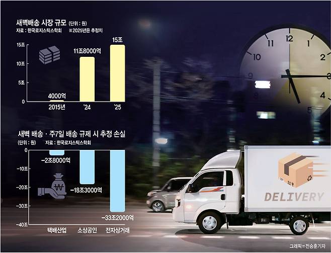 ◇중단 시 예상되는 여파는= 전문가들은 새벽 배송이 금지될 경우 소비자 편익 저하와 일자리 감소, 영세 업체 매출 타격 등 연쇄 피해가 빚어질 것으로 보고 있다. 최동현 중앙대 국제물류학과 교수 연구에 따르면 새벽 배송과 주 7일 배송이 가능해지면서 직접 시장 규모 외 6조 원가량의 부가가치가 창출됐다. 또 1만9000명가량 취업·고용 효과도 생겨났다. 물류업계 전문가는 “새벽 배송 금지는 단순한 서비스 제한 차원이 아니라, 수만 명의 일자리 감소와 최대 수조 원 규모의 산업 생태계 붕괴를 의미한다”고 우려했다. 신선 물류센터와 포장·패킹 산업, 냉동·냉장창고, 전기차 배송 인프라, 물류 정보기술(IT), 스마트 로봇 물류 등 최대 30조 원 이상 연동된 연관 산업 전반이 직격탄을 맞을 수 있다는 설명이다. 소비자들이 가장 먼저 타격을 받을 것이라는 지적도 나온다. 퇴근 후 장보기가 어려운 맞벌이 부부의 경우 유아용 분유·기저귀·신선 식재료 등을 새벽 배송에 의존해왔다. 여기에 새벽 배송을 본업으로 선택한 택배 기사들의 수입·일자리 감소 등 생계 위협도 불가피할 것으로 전망된다.