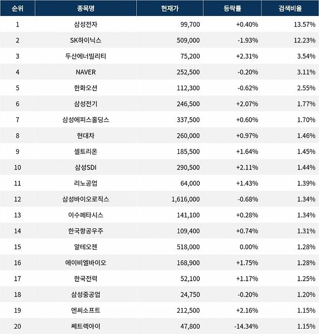 이어 SK하이닉스(000660)가 검색비율 2위를 기록하며 1.93%의 하락세를 기록하고 있다. 검색비율 3위의 두산에너빌리티(034020)는 2.31% 상승하며 순조롭게 출발하는 모습이다. 검색비율 4위 NAVER(035420)는 개장 초반부터 0.20%의 하락률로 횡보하고 있다. 검색비율 5위 한화오션(042660)은 0.62% 하락하며 큰 움직임을 보이지 않고 있다.