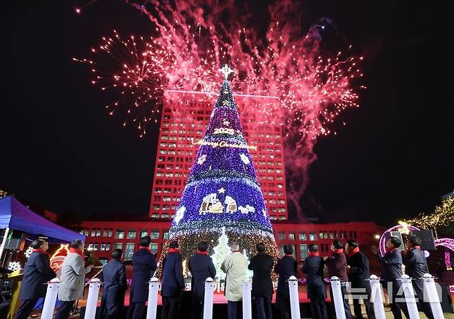 [대전=뉴시스] 2026년 1월 17일까지 불을 밝힐 성탄트리 점등식이 25일 오후 6시 대전시청 남문광장에서 열리고 있다. 대전광역시기독교연합회 주최로 진행된 점등식에서 이장우 대전시장을 비롯한 종교계, 시민 등이 점등을 축하하는 축포를 지켜보고 있다. (사진=대전시 제공) 2025. 11. 26 photo@newsis.com