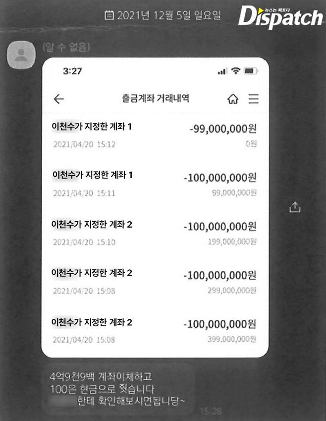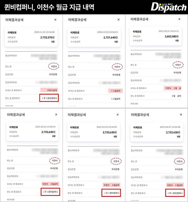 그곳에, 또 이천수가 있었다. '디스패치'는 퀸비컴버니 계좌이체 내역을 확인했다. 이천수는 2020년 11월부터 2021년 5월까지 월급을 받아 갔다. 임금은 세후 275만 원.