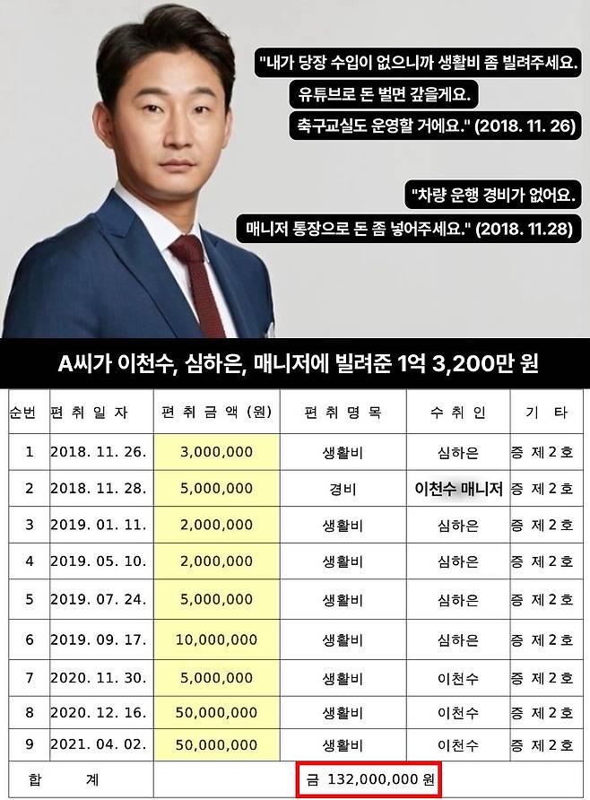 A씨의 지인은 '디스패치'에 "이천수가 예능 촬영 때문에 이사를 가는데 보증금이 부족하다며 5,000만 원을 빌려 달라고 했다"며 당시 상황을 전했다.