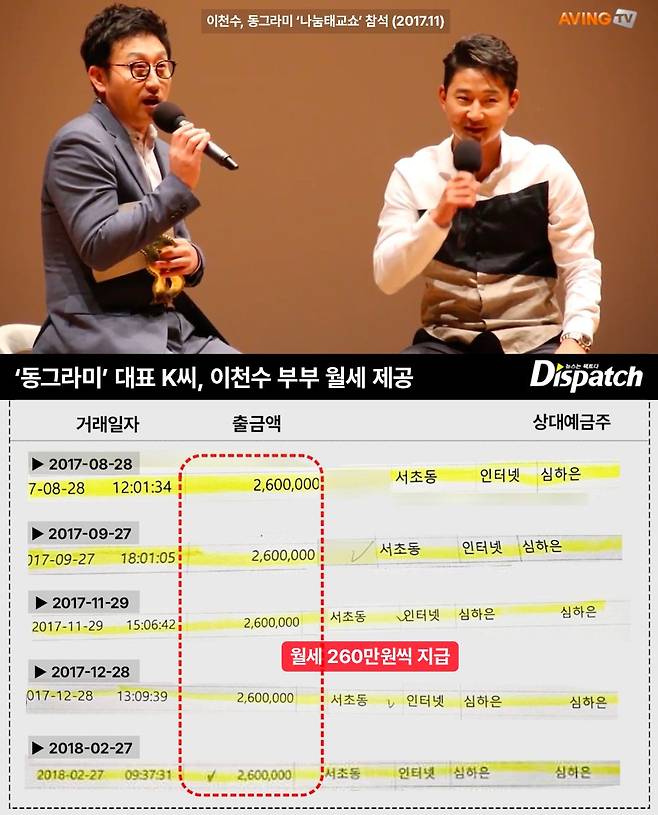 '디스패치'는 (동그라미에서) 심하은 통장으로 입금된 이체 내역을 확인했다. 2017년부터 2018년까지 월세 260만 원이 입금됐었다.