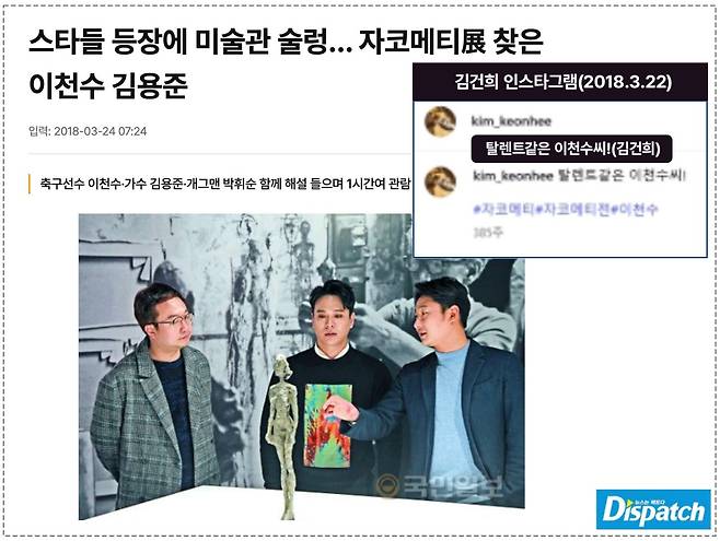 여기에도, 이천수다. 그는 해당 전시회에 얼굴을 내밀었다. 가수 김용준, 개그맨 박휘순 등과 함께 자코메티 작품을 감상한 것. 김건희 여사와 기념사진도 찍었다.