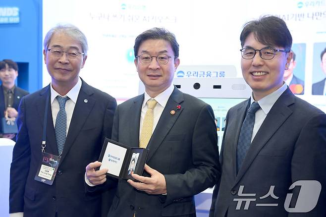 (서울=뉴스1) 오대일 기자 = 이억원 금융위원회 위원장을 비롯한 내빈들이 26일 오전 서울 서초구 aT센터에서 열린 코리아 핀테크 위크 2025에 마련된 우리금융그룹 부스에서 금융사기를 예방하는 AI 키오스크 시연을 마친 뒤 기념촬영을 하고 있다. 왼쪽부터 임종룡 우리금융지주 회장, 이 위원장, 김건 한국핀테크지원센터 이사장. '핀테크 X AI, 금융에 취향을 더하다'라는 주제로 열리는 이번 박람회는 오는 28일까지 사흘간 진행된다. (공동취재) 2025.11.26/뉴스1