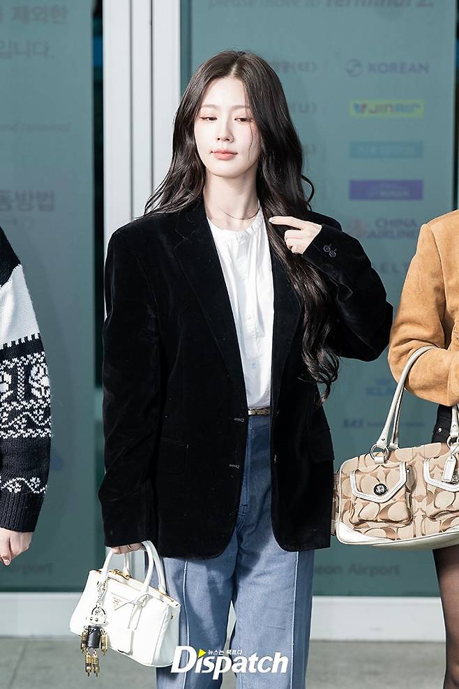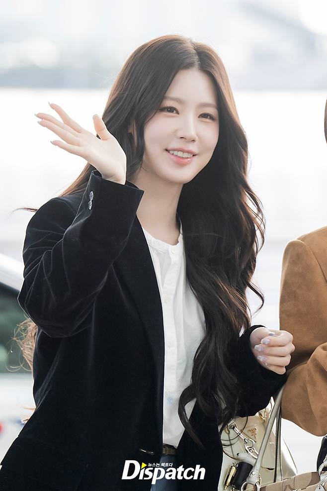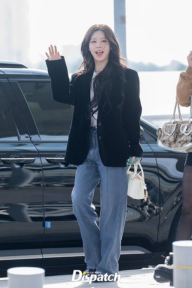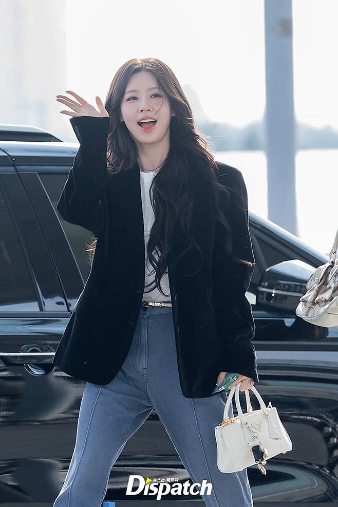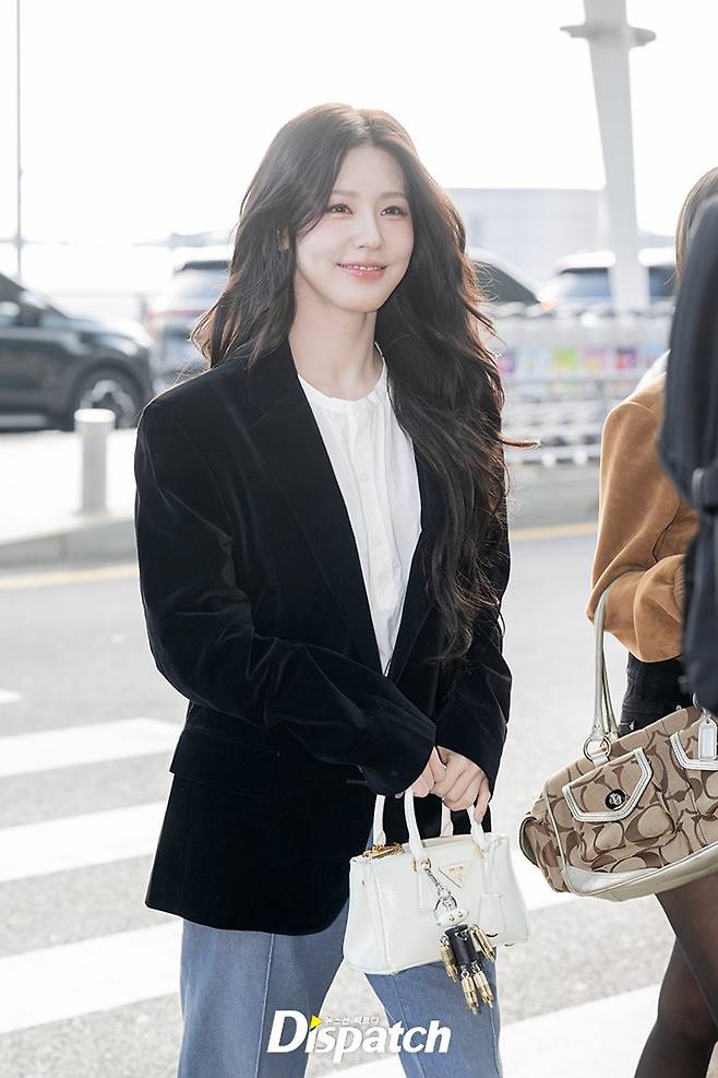미연은 블랙 벨벳 재킷과 데님 팬츠로 심플한 공항 패션을 완성했다. 아름다운 미모가 돋보였다.