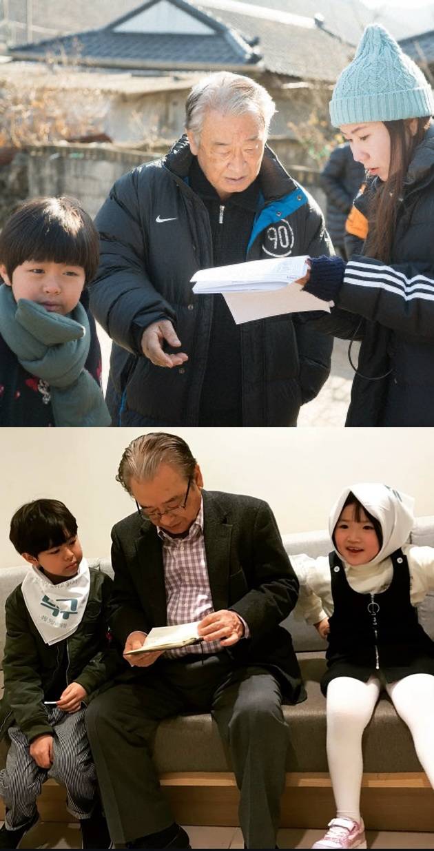 사진 속 故 이순재는 '덕구' 당시 어렸던 아역배우들 사이에서 대본을 보는가 하면 아이들을 안고 다정하게 미소짓고 있어 눈길을 끈다.