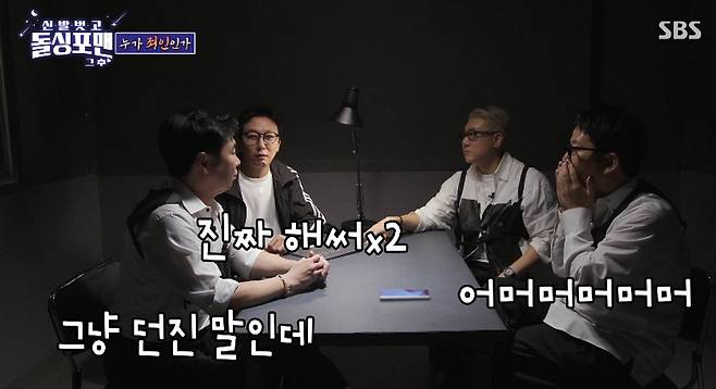 탁재훈은 "오늘 왜 조사받으러 왔는지 아냐"라고 말하며 이상민과 김준호를 장난스럽게 몰아세웠다.