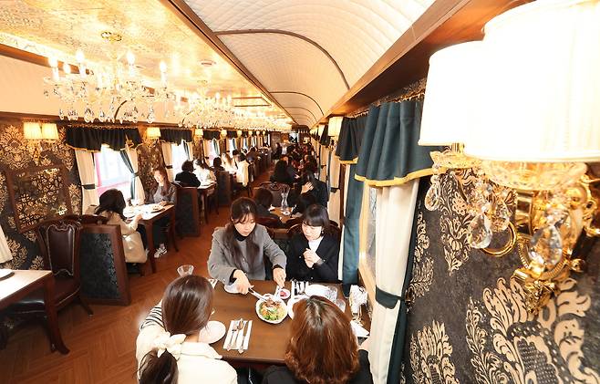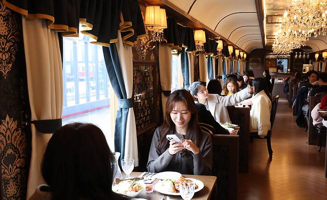 26일 서울 노원구 화랑대 철도공원 유럽풍 특급열차 레스토랑 '익스프레스 노원 by 미라쥬'에서 열린 '만족도 조사를 위한 시식체험' 참가자들이 식사를 하고 있다.