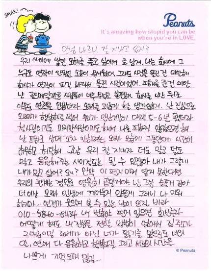 이어 "난 진심으로 오빠가 행복하길 빈다", "우리가 만난 기간이 대략 5~6년 됐다. 첫사랑이기도 마지막 사랑이기도 해서 나를 피하지 않았으면 해", "날 피하고 상대조차 안 하려는 오빠 모습에 그동안의 시간이 허무하고 허탈하다", "편지를 읽으면 회신을 달라" 등의 내용도 포함돼 있다.