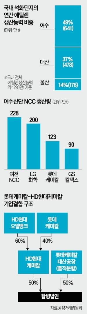 롯데케미칼과 HD현대케미칼이 대산 공장 NCC를 하나로 합치기로 한 결정은 정부의 구조조정 로드맵 이후 첫 구조조정 사례다. 핵심은 롯데케미칼의 정유·석유화학 수직계열화다. 롯데 측이 석유화학 사업부를 분할해 신설법인을 세우면 HD현대가 흡수 합병한다. 이 안이 실행되면 정부와 업계가 합의한 NCC 감축량(최대 370만t)의 3분의 1가량인 110만t이 감소한다.