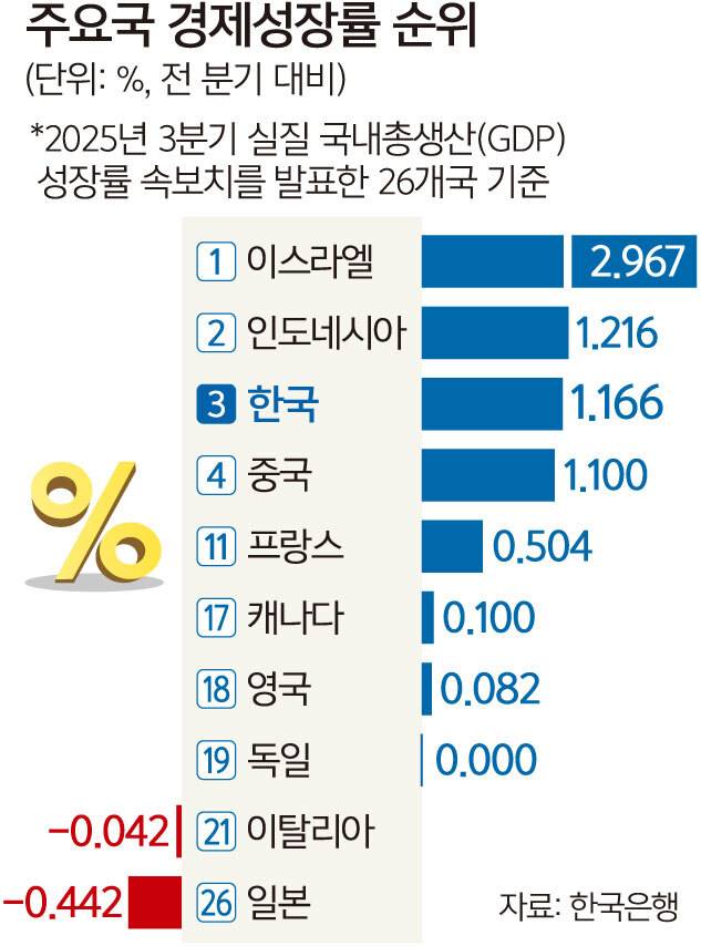 26일 한국은행과 경제협력개발기구(OECD)에 따르면 한국의 3분기 GDP 성장률은 1.166%로, 전날까지 속보치를 발표한 주요 26개국 중 3위를 기록했다.