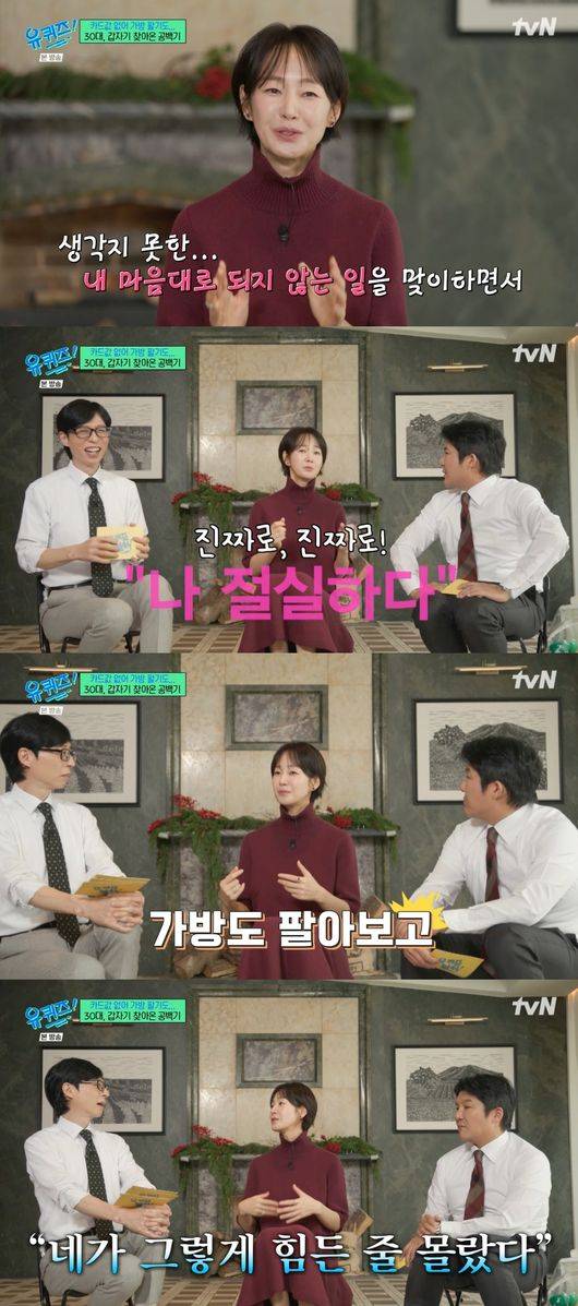 이어 "그러다 보면 일이 들어온다. 특별출연이라도 들어오고. 그러다 보면 또 없어지더라. 또 반복이었다. 열심히 기도하면 또 딱 맞게 들어왔다"라고 회상했다. 특히 그는 "카드값을 낼 수 있는 가방도 팔아봤다. 뭐가 더 돈이 되나 살펴도 봤다. 또 혼자 가긴 부끄러워서 친구랑 가기도 했다"라고며 "나중에 난 기사를 보고 친구가 연락이 왔다. 몰랐다고. 속사정을 말 안 하고 같이 가자고만 하니. 그걸 보고 친구가 밥을 사주더라. 힘든 게 힘든 것만은 아닌 것 같다"라고 담담하게 말했다.