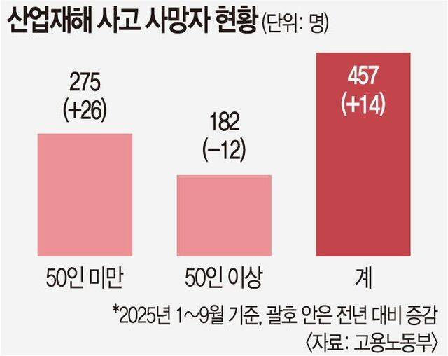 산재 다발 사업장에 대한 감독 책임이 분산되는 것 아니냐는 우려도 있다. 전날 노동부 발표에 따르면 올해 9월까지 재해조사 대상 산재 사망자는 총 457명으로 지난해 같은 기간(443명)보다 14명(3.2%) 늘었다. 50인 이상 사업장에서는 산재 사망자가 감소했지만 50인 미만 사업장이 증가세를 견인했다.