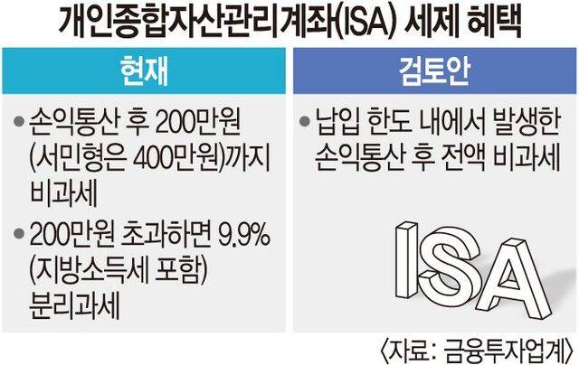 올해로 예정했던 금융투자소득세(금투세) 도입을 전제로 개인종합자산관리계좌(ISA)에서 발생하는 이익을 전액 비과세하는 방안이 정부와 정치권에서 검토됐던 것으로 확인됐다. ISA는 주식과 상장지수펀드(ETF) 주가연계증권(ELS) 등 금융투자상품 투자 손익을 통산해 비과세 혜택을 주는 계좌로 장기 투자를 유도하기 위해 설계됐다. 다만 금투세가 폐지되면서 전액 비과세 혜택은 없던 일이 됐다.