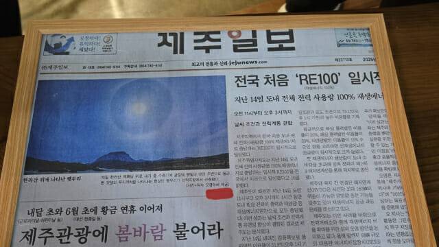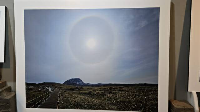 "매일 해 뜨기 전에 일어나 여러 장소에서 일출을 기록했는데, 개인적으로 해(SUN) 사진들이 제일 많기도 하고 특별하다. 그 중 한라산 영실코스에서 만났던 '햇무리' 사진은 그 대기현상이 포착되기 쉽지 않아 제주 신문 1면에 게재되기도 했다(아래 사진). 햇빛이 대기 속의 수증기나 얼음 알갱이에 비춰 해의 둘레에 둥글게 나타나는 테두리다. 해를 둘러싼 커다란 빛의 원형, 해의 모습도 자연 속에서 정말 다양하다. 하나 더 사진을 소개하면, 제가 '구름 UFO'라 이름 지은 사진이다. 구름의 모양, 빛의 굴절이 서귀포 상공에 엄청 큰 UFO를 띄운 거다. 이 사진은 2025년 제 2회 '클림트 어워즈' 입상작이 돼 개인적으로 무척 영광이기도 하다."