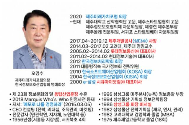 삼성그룹 공채 22기인 그는 경영학(고대)을 전공했지만 삼성그룹 비서실 재직 시절, 현 삼성 그룹웨어 '싱글(SINGLE)' 전신 ‘토픽스(TOPICS)’ 개발과 운영을 맡으며 IT 업계에 발들 디뎠다. 이후 삼성 미주 IT센터장, 시큐아이 대표를 거쳐 롯데정보통신과 제주개발공사 사장을 역임한 대표적 IT 리더 출신이다. 40여 년간 서울에서 직장생활을 이어오다 2017년 고향 제주로 돌아가 서귀포의 바다·한라산·귤밭·올레길에서 마주한 순간들을 꾸준히 스마트폰으로 기록, 이날 '오경수 사진전'을 열었다.