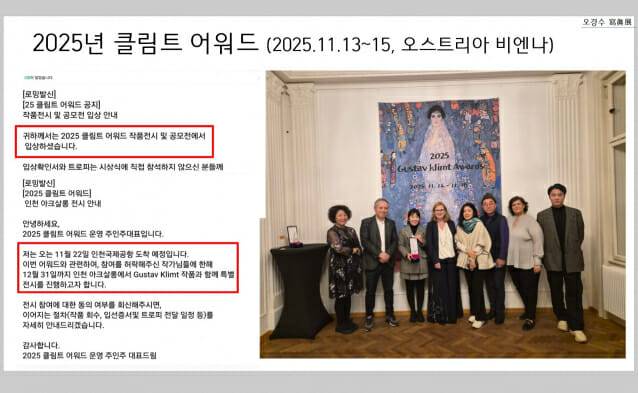 2015년 '메모로 나를 경영하라'는 책을 낸 이후 10년 만에 연 이번 전시는 그가 매일 새벽 바닷가에서 포착한 여명과 일출, 고향집 귤밭 풍경, 올레길에서 발견한 자연의 순간 등을 담았다. 이날 선보인 20여 작품 모두 그가 2023년 구입한 '갤럭시 스마트폰'으로 찍은 것이다. 특히 이 작품 중 한 점은 오스트리아에서 이번달 13~15일 열린 '2025년 클림트 어워드'에 출품, 입상하기도 했다(아래 사진). 이날 오 작가는 "지금 인천항으로 (수상) 트로피가 오고 있다"며 반색했다.