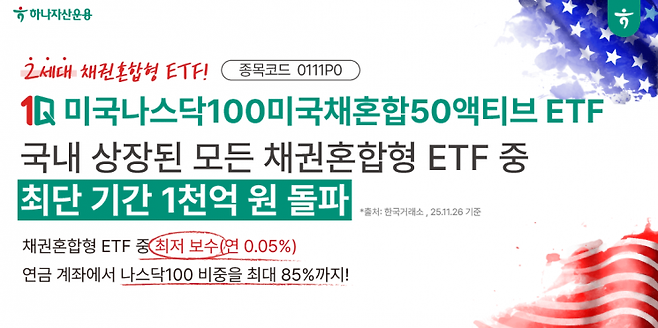 하나자산운용은 '2세대' 채권혼합ETF인 1Q미국나스닥100미국채혼합50액티브 ETF 순자산이 상장 후 약 2개월 만에 1000억을