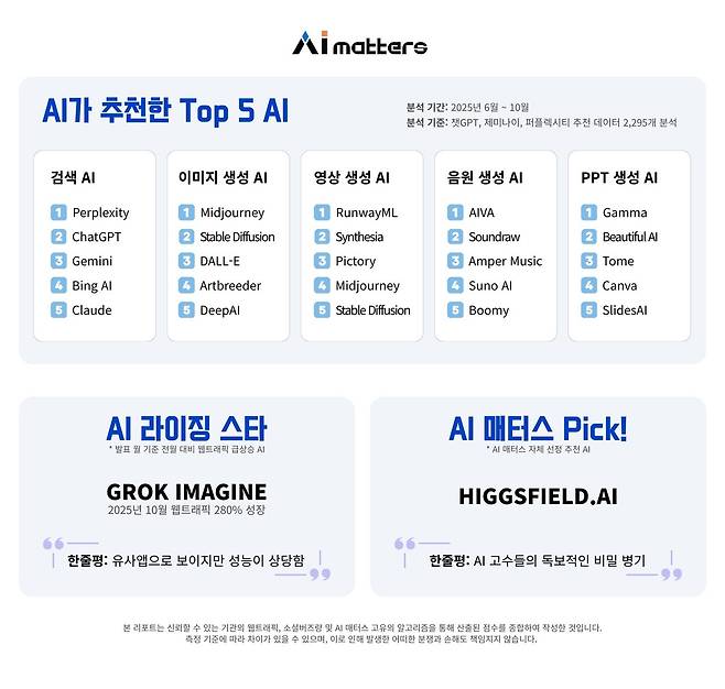 'Top 10 AI' 차트 외에도 AI가 직접 추천한 툴을 정리한 'AI 추천 Top 5' 차트도 함께 공개됐다. AI 매터스는 생성형 AI가 가장 많이 쓰이는 검색, 이미지 생성, 영상 생성, 음원 생성, PPT 생성 등 5개 주요 분야에 대해 생성형 AI가 실제로 추천한 데이터를 분석하고 빈도 기반으로 순위를 선정했다. 그 결과 검색 분야에서는 챗GPT, 이미지 생성에서는 미드저니, 영상 생성은 런웨이, 음원 생성은 수노, 프레젠테이션 생성 분야에서는 감마가 각각 1위를 차지했다.