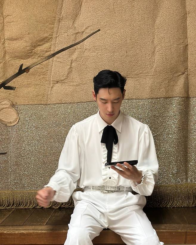 공개한 사진에서 이제훈은 새하얀 수트 차림으로 건물 옥상 난간에 몸을 기댄 채 하늘을 향해 포효하듯 웃고 있는 모습. 푸른 하늘 아래 해방감 가득한 표정이 '김도기'의 당당한 에너지를 그대로 옮겨놓은 듯하다. 다음은 깔끔한 화이트 셔츠와 블랙 리본 타이가 포인트인 의상을 입고 촬영 대본을 검토하는 모습이 포착됐다. 집중한 눈빛 속에서 특유의 날카로운 '도기'의 기운이 묻어났다.
